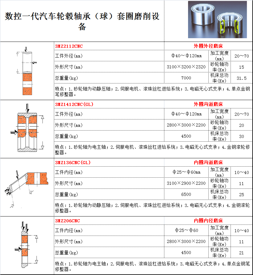 用途:磨削一代汽車輪轂軸承的套圈(球) 特點: 1.砂輪軸為動靜壓軸; 2.伺服電機、滾珠絲杠進給系統; 3.電磁無心式支承; 4.單點金鋼筆凸度修整器。