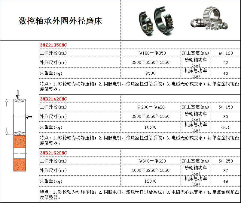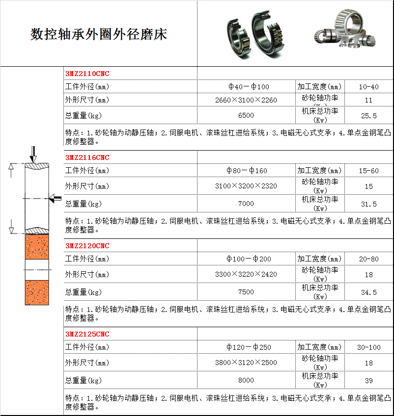 用途:磨削軸承外圈的外徑 特點: 1.砂輪軸為動靜壓軸; 2.伺服電機、滾珠絲杠進給系統; 3.電磁無心式支承; 4.單點金鋼筆凸度修整器。