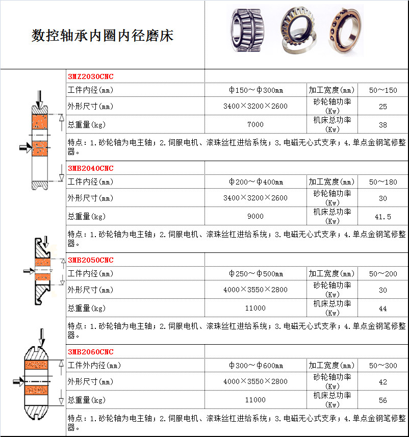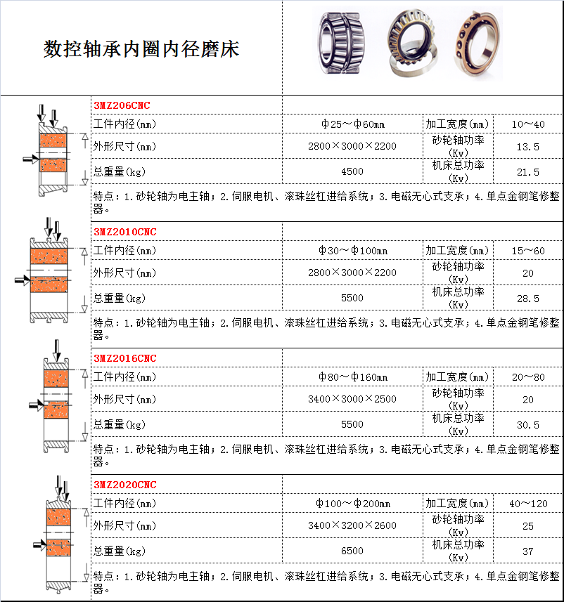 用途:磨削軸承內圈的內徑 特點: 1.砂輪軸為電主軸; 2.伺服電機、滾珠絲杠進給系統; 3.電磁無心式支承; 4.單點金鋼筆修整器。