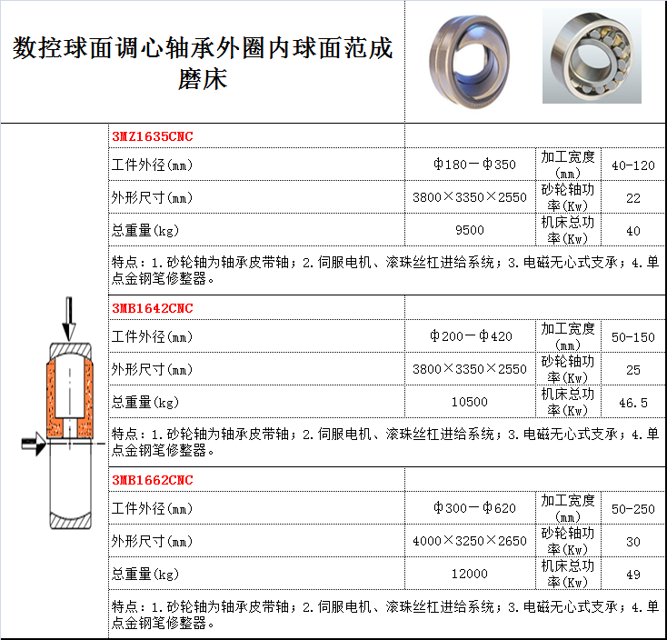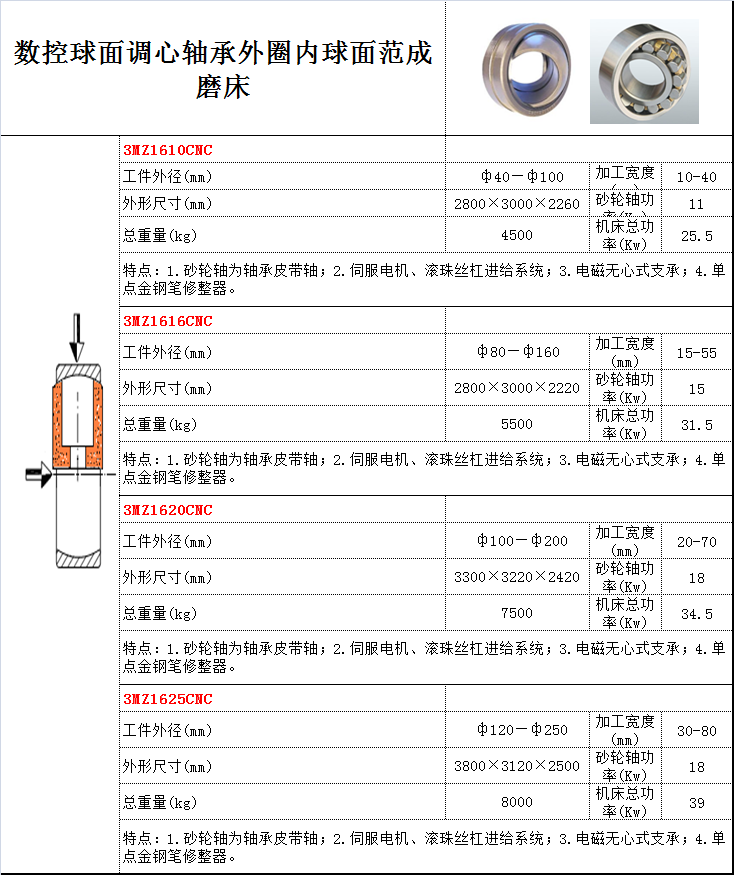 用途:磨削球面調心軸承外圈的球面滾道 特點: 1.砂輪軸為動靜壓軸; 2.伺服電機、滾珠絲杠進給系統; 3.電磁無心式支承; 4.單點金鋼筆凸度修整器。