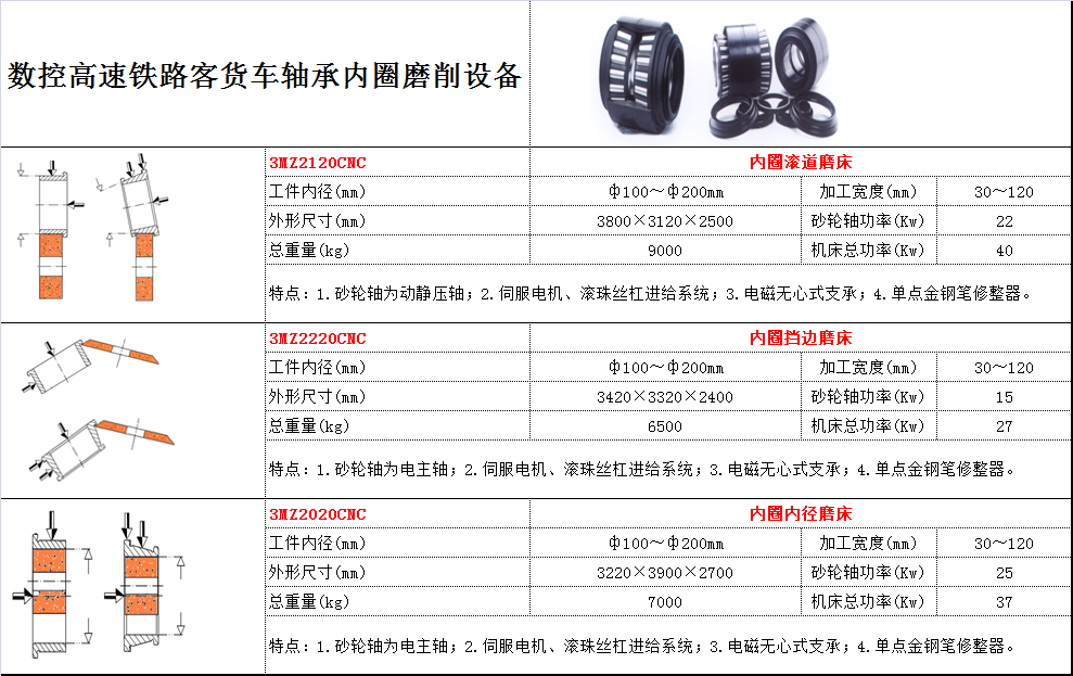 用途:磨削高速鐵路客貨車軸承的內圈 特點: 1.砂輪軸為動靜壓軸; 2.伺服電機、滾珠絲杠進給系統; 3.電磁無心式支承; 4.單點金鋼筆凸度修整器。